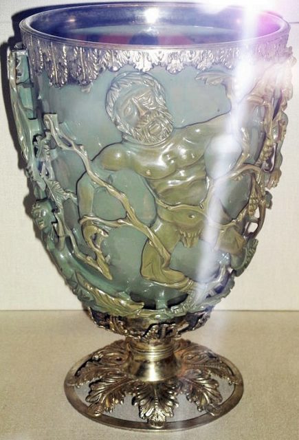 It is called the Lycurgus Cup because of the scene that is engraved on the outer surface: a depiction of the triumph of Dionysus over King Lycurgus, the ruler of the Edoni people in Thrace. This Roman cage cup is also known as diatretum, and it consists of a bowl made of glass that has a shell or cage decoration around it.