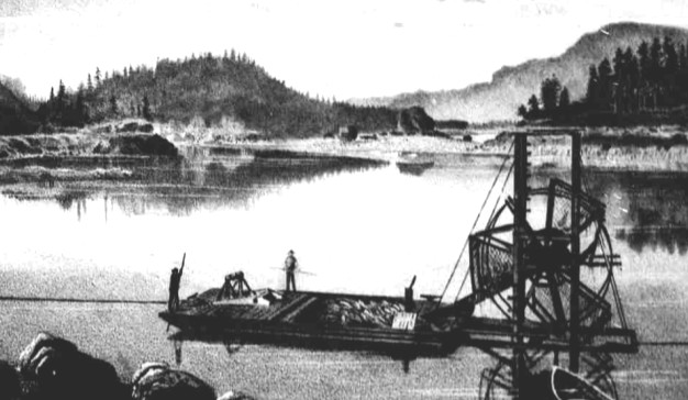A fish wheel is a water-powered device used for catching fish, particularly salmon. Their design was simple: it consists of a revolving wheel with baskets and paddles attached to its rim. The wheel rotates due to the current of the stream pressing the bottom basket or paddle that has swung down into the water.