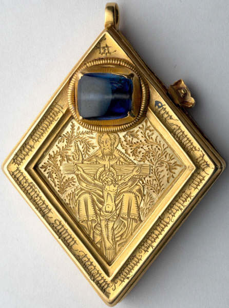 On the back side of the jewel, there is an engraving of the Nativity, with fifteen saints around the Lamb of God. Only a few of the saints can be identified as St George, Catherine of Alexandria, St Peter, St Barbara, St Anne, Dorothea of Caesarea and St Margaret of Antioch.