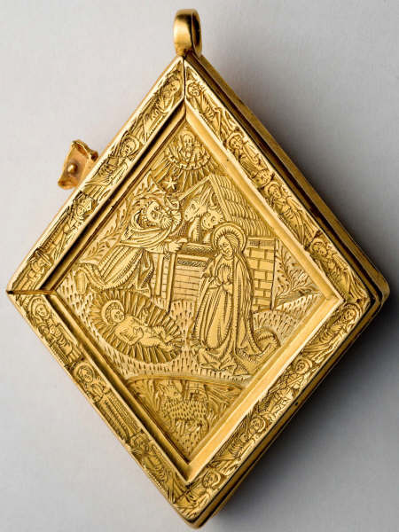 It is a remarkable piece of jewelry because of the engraving of the two scenes of the Trinity and Nativity.
