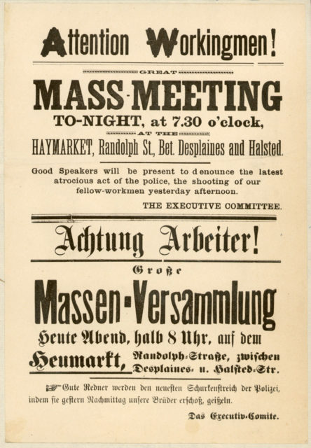 Everything began when thousands of workers around the country went on strike and held rallies to demand an eight-hour workday. People went on peaceful strikes, and one of their cries was: “Eight-hour day with no cut in pay.” On May 3rd, the Chicago workers assembled near the McCormick Harvesting Machine Company plant where August Spies (an American anarchist and one of the organizers of the eight-hour movement who was executed during the Haymarket Affair) called them to “hold together, to stand by their union, or they would not succeed.” Everything was peaceful up to that point, but when the bell sounded the end of the workday, some of the workers confronted the strikebreakers. The police reacted and started shooting at the crowd and killed two workers. This caused huge outrage among the local workforce and anarchists. Soon, fliers were printed that called people to a huge rally at Haymarket Square in Chicago.
