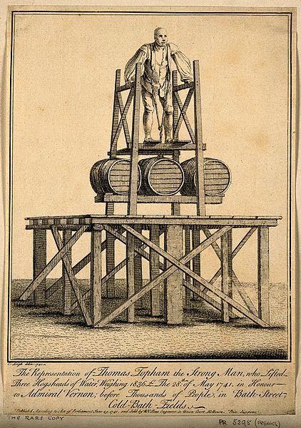 The list ends with Thomas Topham, one of the most famous strongmen of the 18th century. Topham was born in London in 1702 and performed feats like lifting a weight of 224 pounds over his head using only his little fingers and bending thick pokers with his forearm.