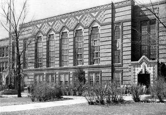 Further additions were made to the campus in 1938 with the construction of a pool and gym, together with the health department. In 1950 a mechanical drafting and shop wing was built, for Detroit was after all Motor City. The crown jewel of the overall work was the façade: an artistic multicolored masterpiece comprised of thousands of colored tiles and high gloss polished terracotta created by Pewabic Pottery.