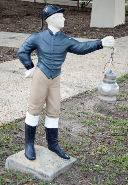 The origin of the black jockey has been linked to the legend of Jocko Graves, a young boy helping George Washington in the Revolutionary War. In this story, a 12-year-old Jocko follows his father to join General Washington’s Army as it crosses the Delaware River on Christmas Eve 1776. The general won’t allow the young man to fight and instead orders him to stand on the riverbank holding a lantern, so the men will know the way back to camp after battle. When they return two days later, they find that the loyal young Jocko has frozen to death, still clutching the lamp. Washington was then said to have created an iron likeness of Jocko as a hitching post, “The Faithful Groomsman.”