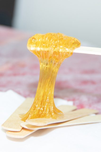 A thick sugar paste is made of honey or melted sugar, lemon juice and molasses. When applied to the skin the hairs stick to the thin layer of paste which is then easy to remove.