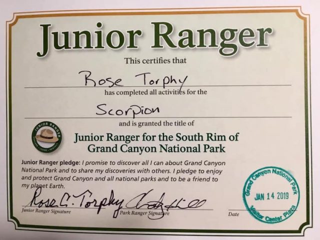 The visit in January was a meaningful recreation of Ms. Torphy’s first trip to the Canyon over 30 years ago with her late husband. Though dependant upon a wheelchair, the newly instated Scorpion Junior Ranger was still able to see over the edge. Her daughter remarked upon the impressive accessibility at the National Park.