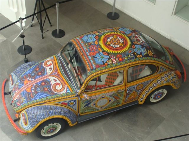 Artists Francisco Bautista Carrillo and his daughter Kena Bautista completed the work with the help of six other artisans from both families. The project to create this Volkswagen bug with beads began in 2010 with the sole purpose of creating a piece of art that would promote Huichol culture and their artistic skills.