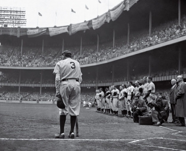 Ruth retired from baseball in 1935. This image was taken at a ceremony at Yankee Stadium to retire his jersey number in June 1948. He was severely ill at the time and had to use his bat as a cane.