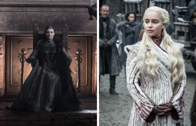 Another detailed costume is what Sansa Stark wears when she becomes Queen of the North in the series finale. Although it appears to be a blackish-grey dress and cloak, the ensemble so much more than that. Each of the details is a nod to someone in her family: the cloak is for Arya, the weirwood leaves are for Bran, black fur for Rickon, grey gown for Ned, and a crown for Robb.