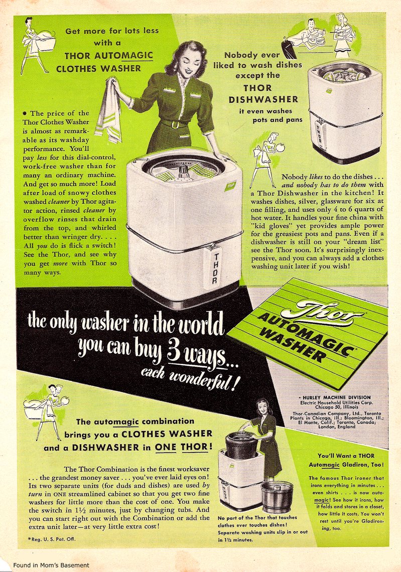 Dishwasher/washing machine –the first washing machine was developed in the early 1900s in the US, and since then were continually developed and improved upon. By the 1940s, electrical company Thor developed the combination dishwasher and washing machine. It was heavily marketed but just didn’t take off particularly because homemakers didn’t want to wash both clothes and dishes together.