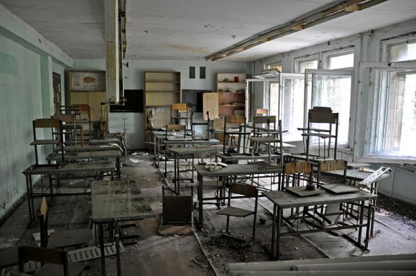 The apocalyptic landscape in Prypyat schools is not due to random shut down. During the Chernobyl nuclear plant explosion, the children from the Prypyat schools were instantly evacuated in order to escape the incoming gas of radioactive dust.