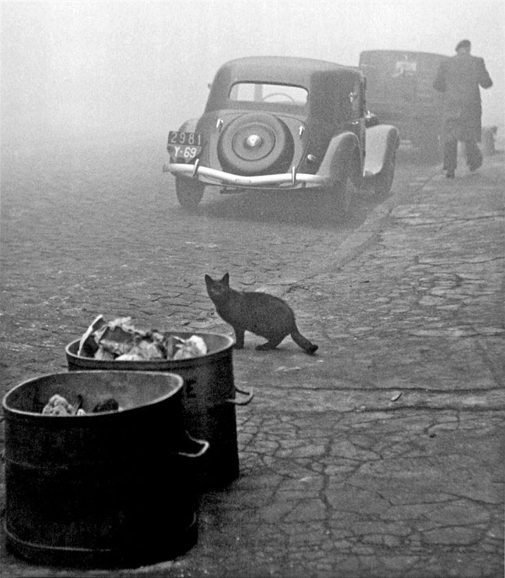 A black cat, a famous symbol of ill-fate, pictured in the misty streets of Lyon, France, 1950. [Via]