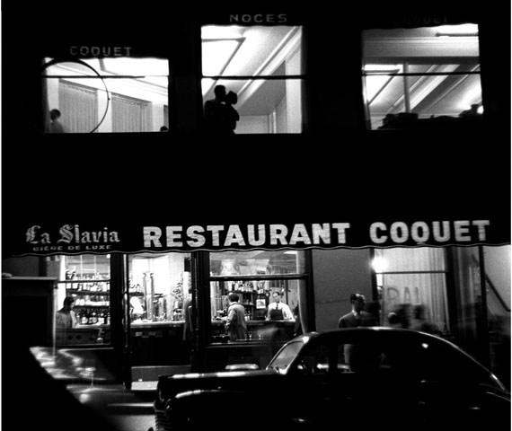 A single camera shot captures different stories in a single restaurant building (Le Restaurant Coquet) in Place Blanche, Paris, 1953 [Via]