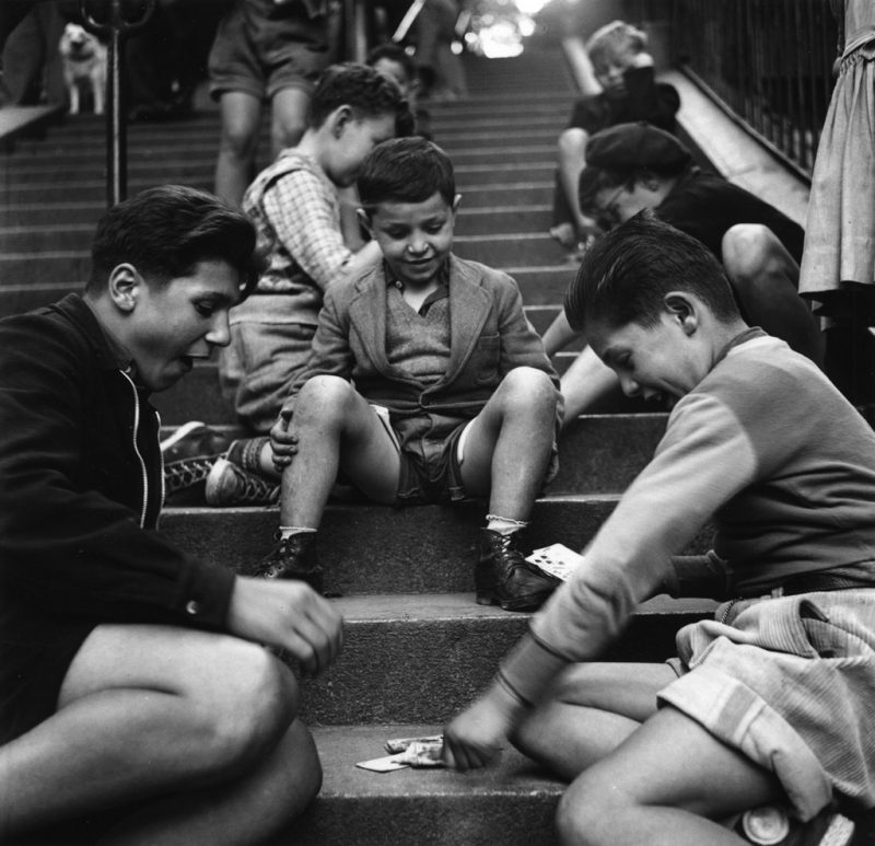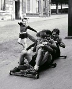 A group of boys playing is a common scene in the streets of Paris, 1952 [Via]