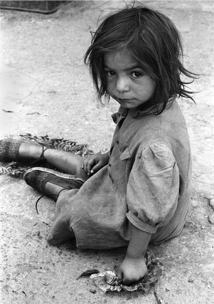 A little girl from Crose clutches on her lace bonnet, 1956 [Via]