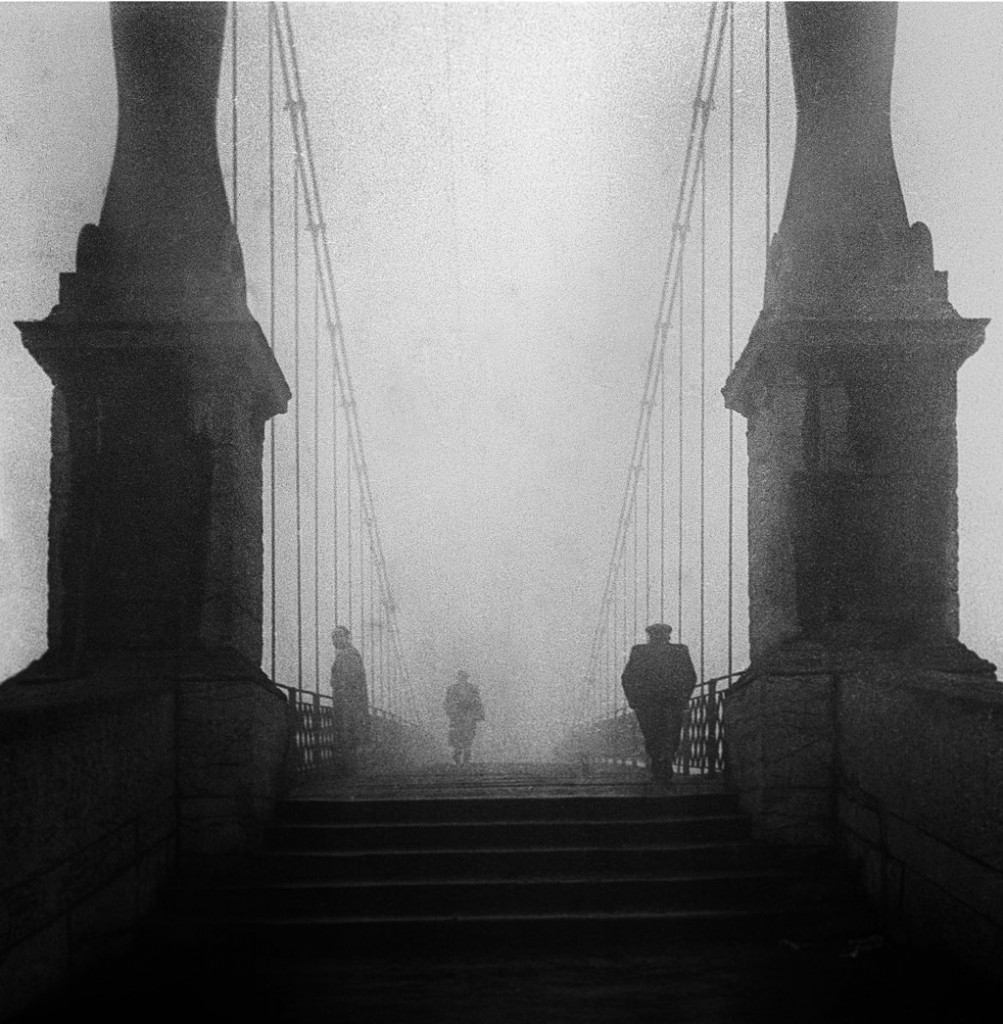A heavy mist creates dramatic silhouettes of passersby at a bridge in Lyon, 1950. [Via]