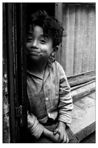 A boy in a corner of Aubervilliers, Paris looks on at the camera, 1950. [Via]