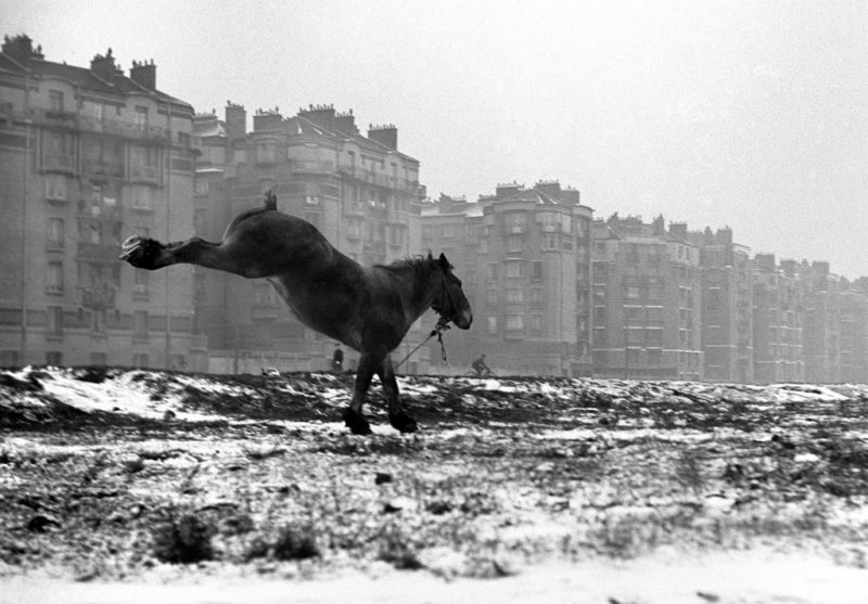 A horse in a cold field across a line of buildings in Porte de Vances, Paris [Via]