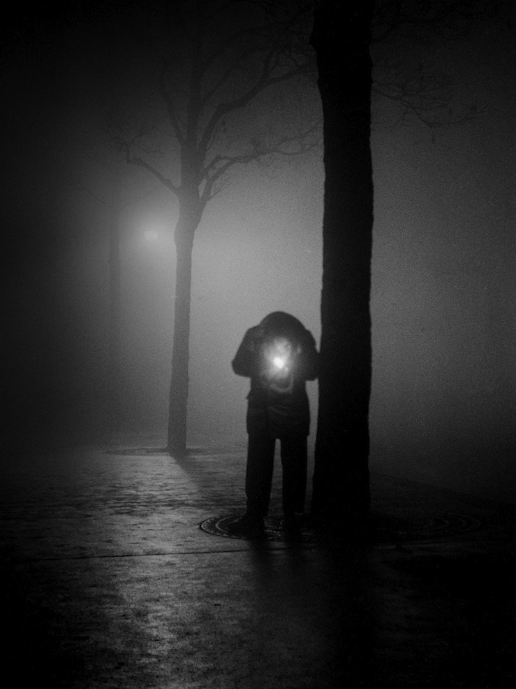 A man seeks warmth from a puff of cigarette during a cold Parisian night, 1950 [Via]