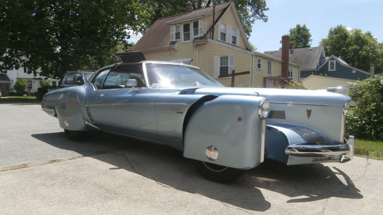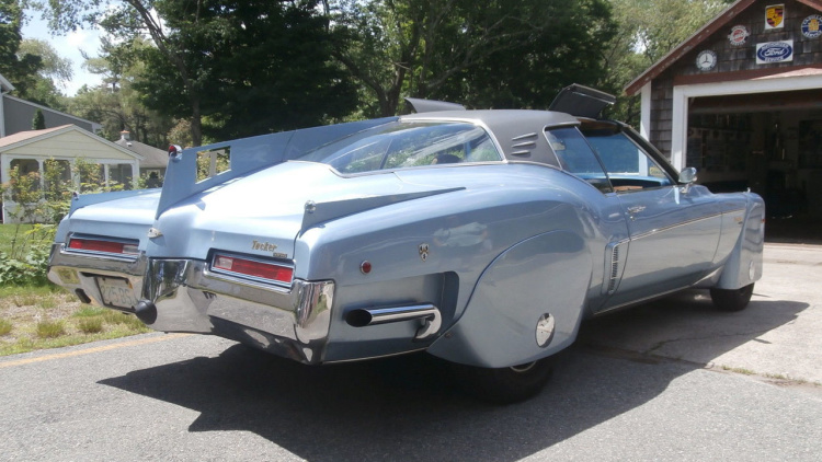 Underneath all of the crazy changes is a 1971 Buick Riviera powered by a 455-cubic-inch (7.5-liter) Buick V8. Some of the replica’s odder modifications include the front fenders that turn with the wheels and the fin running down the back. All three headlights work, but the one in the middle is only for the high beams. Oddly, the small hinged sections on the roof are meant to open to avoid hitting your head when getting in or out. writes Autoblog