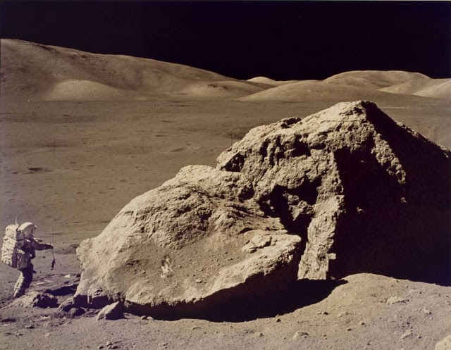 Apollo 17 astronaut Harrison Schmitt collects lunar rock samples