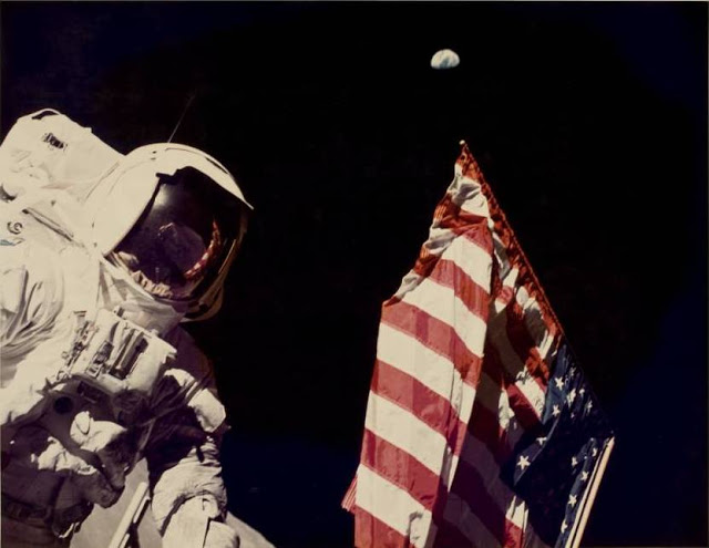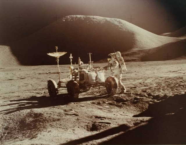 The photographs from the 17th mission include: Commander Eugene A. Cernan, LM pilot Harrison H. Schmitt and CM (Command Module) pilot Ronald E. Evans. Some activities depicted in the collection of twelve images include: the retrieval of a film canister on the outside of a spacecraft, the preparation of a LRV (Lunar Roving Vehicle), collection of lunar samples and, of course, the overall exploration of the moon’s surface.via