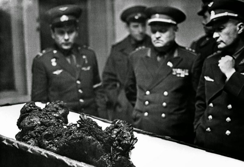 Mankind’s road to the stars had its unsung heroes. One of them was the Soviet cosmonaut Vladimir Komarov. His spaceflight on Soyuz 1 made him the first Soviet cosmonaut to fly into outer space more than once, and he became the first human to die on a space mission—he was killed when the Soyuz 1 space capsule crashed after re-entry on April 24, 1967 due to a parachute failure. However, because he died when the capsule crashed into ground, he is not considered the first human fatality in outer space. The above photograph shows the charred remains of Komarov being looked over by Soviet officials during his open casket funeral. Only a chipped heel bone survived the crash.