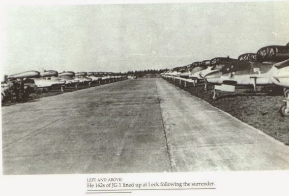 | Another angle on the 120 He 162s at Leck when Germany surrendered |