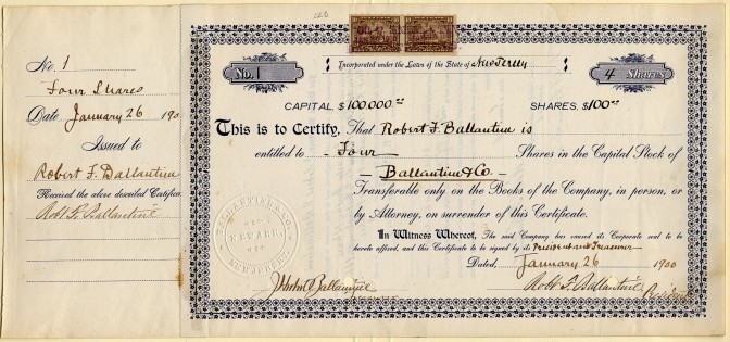 Ballantine & Co. Brewery – RARE Certificate #1 signed 3 times by Robert Francis Ballantine – New Jersey 1900
