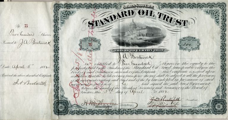 Standard Oil Trust signed by John. D. Rockefeller, Henry M. Flagler and Jabez Abel Bostwick 1882