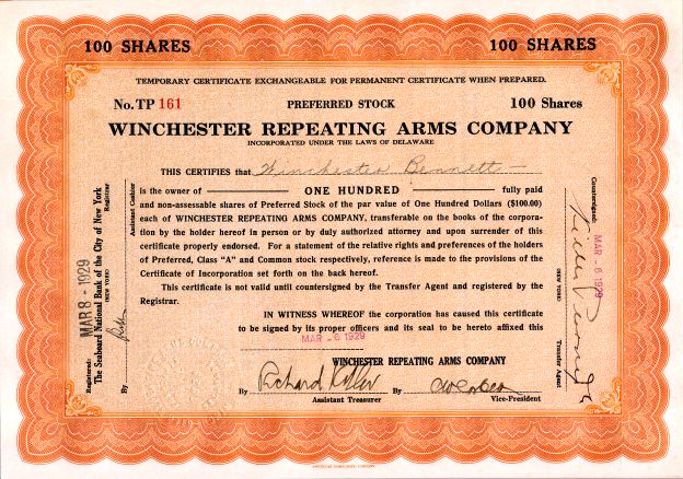 Winchester Repeating Arms Company issued to Winchester Bennett – 1929