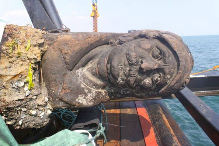 A rudder which features a man’s face carved into the wood has been found in the Swash Channel Wreck. Archaeologists think that it was a Dutch trading ship which sank in the early 17th century.