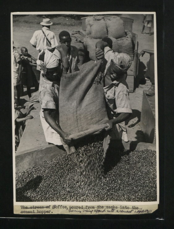 Coffee berries being tipped into a cement hopper. (Picture issued 1945)