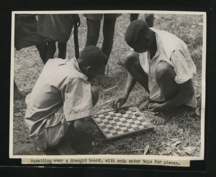 Squatting over a draught board, with soda water tops for pieces. (Picture issued 1945)