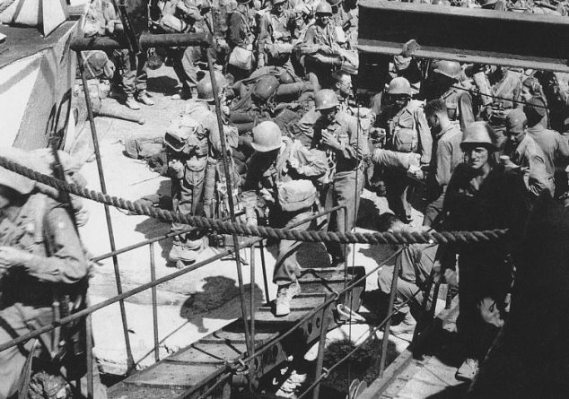 Official U.S. Army photograph, taken a Pozzuoli near Naples in August 1944, that happened to capture Private First Class Steve Weiss boarding a British landing craft. He is climbing the gangplank on the right-hand side of the photograph.