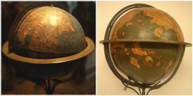 After more European voyagers started sailing the Seven Seas, globe-making became a more established craft in Europe. One globe that intrigues many because of its age and uniqueness of construction is the Erdapfel, German for “earth apple.” This is the world’s oldest surviving terrestrial globe. Credit for its creation goes to Martin Behaim, a polymath of his day who knew a lot about geography and philosophy–and was also skilled as a salesperson. His globe shows the world as people of the late 15th century understood it.