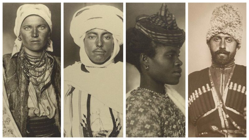 There are portraits of young ladies from Italy and Norway, proudly posing with their national costumes, In another, a young Hindu gentleman is shown sitting, with robes, long hair and neat headcap. Several photos show people from parts of the Austro-Hungarian Empire: a trio of women from Slovakia, another woman and child from there, a woman from Ruthenia and two shepherds from Romania, one holding a flute to his mouth.