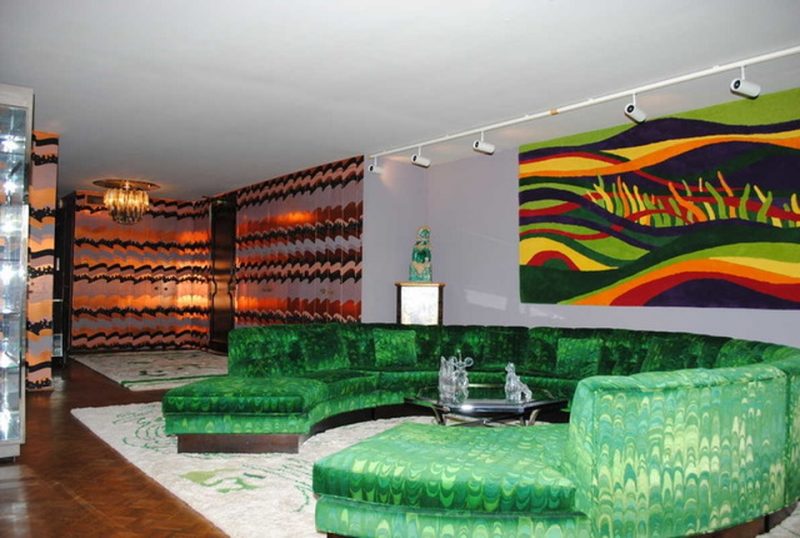 The living room is probably the most remarkable part of the apartment. The huge circular green couch is the centerpiece of the room. The room looks glamorous and groovy, warm and luxurious. It surely has the psychedelic vibe of the 1970s. The room combines both the green and the orange.