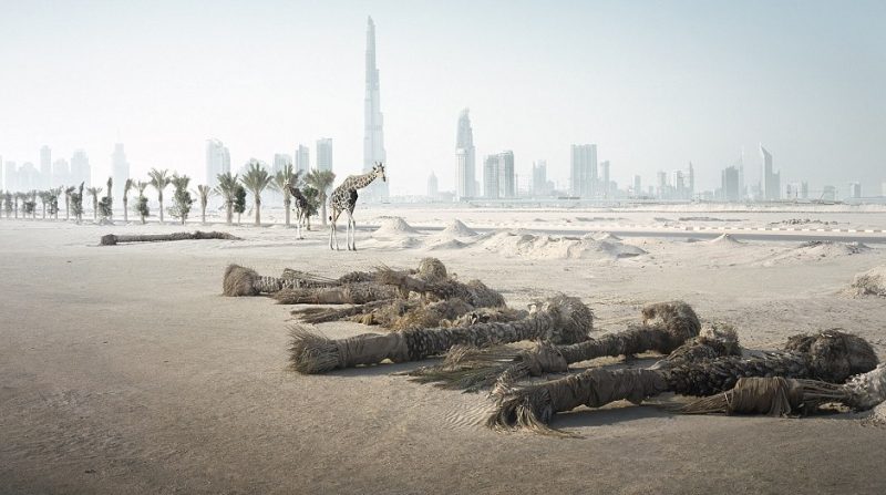 Due to the debts of the city, the place is nearly abandoned. The skyscrapers and resorts stand vacant and the grass on the golf course appears to be radiant green in the desert city. Without sponsors in the city, two million people were left out of work, resulting in their fully abandoning what was once an extremely wealthy city. Even the newest buildings that were in the process of being finished have been left abandoned. What Allenby-Pratt was hoping to accomplish with his photographs was depicting the thin line that animals and humans walk on and cross once in a while. Humans took over so much land, stealing it from the wildlife. Now it is time for the wildlife to take back the land.