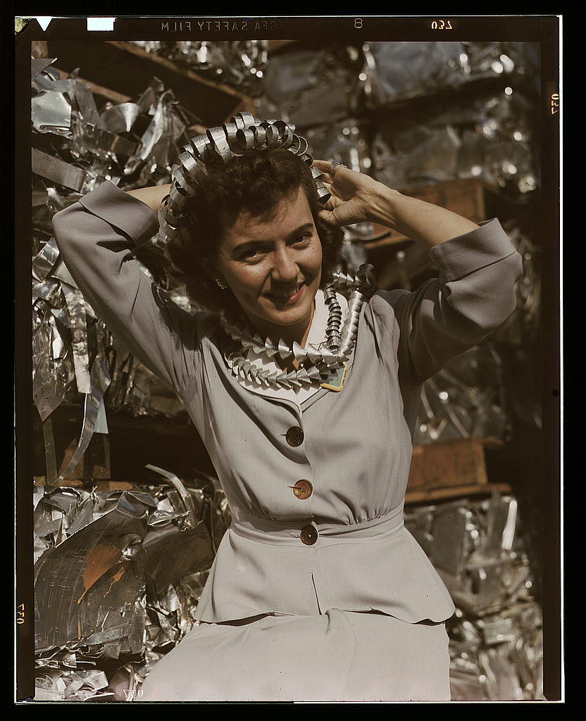 Annette del Sur publicizing salvage campaign in yard of Douglas Aircraft Company