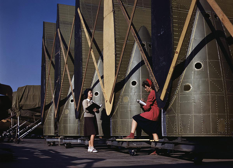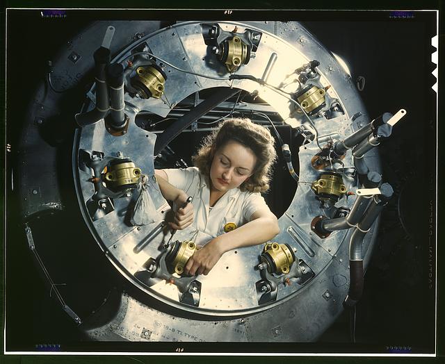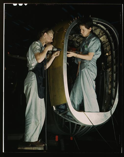Riveter at work on Consolidated bomber, Consolidated Aircraft Corp., Fort Worth, Texas