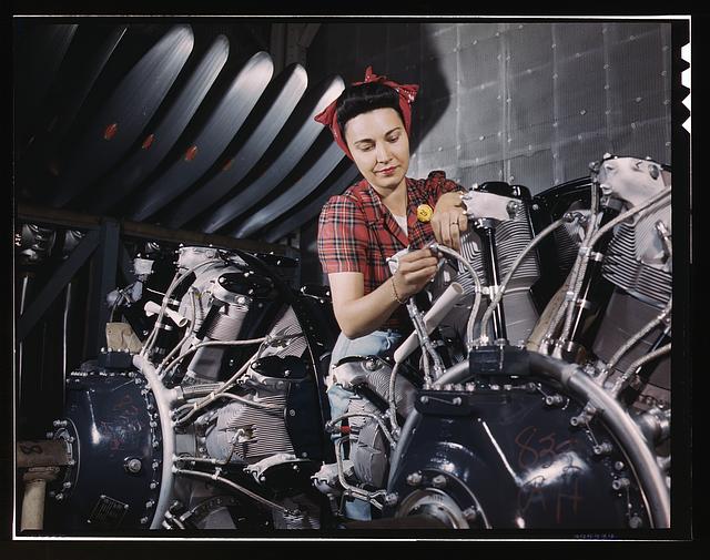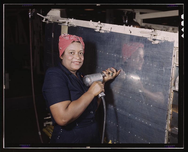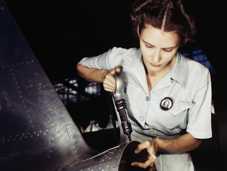 Operating a hand drill at Vultee-Nashville, woman is working on a “Vengeance” dive bomber
