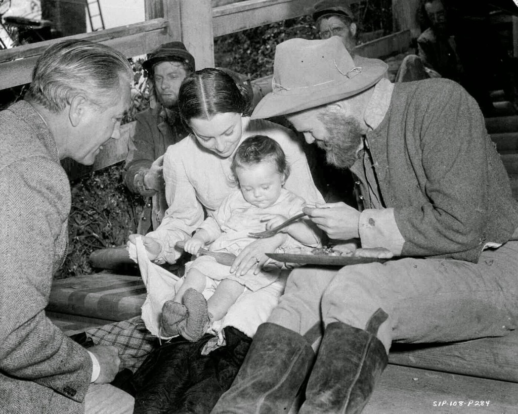 Olivia De Havilland as Melanie Hamilton, with Ric Holt as Beau Wilkes (11 months) seated on her lap. Seated alongside is Phillip Trent as a hungry solider, and director Victor Fleming.