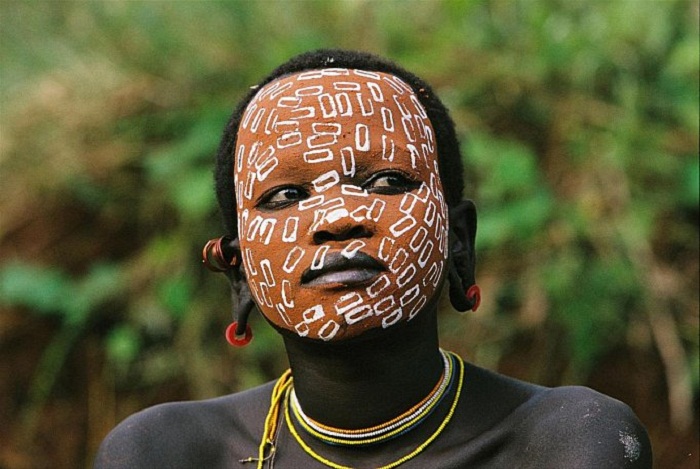 The Surma and Mursi people use the colors of nature, the texture of the animals as an inspiration and use pulverized minerals as materials for their body art. The Mursi have a long history and tradition of body art. Both men and women pierce their ears for discs. They use red ochre, yellow sulfur, white kaolin, white limestone and gray ash, which are common minerals in the area.
