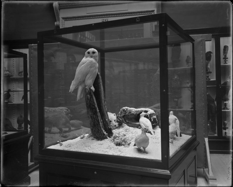 Lions and cougars. Large cats in glass exhibit cases and in a diorama group. Late 19th-century taxidermy, 1899
