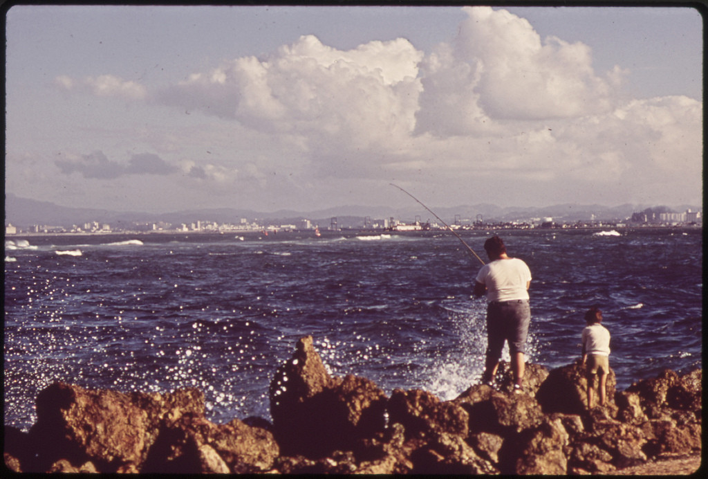Father and Son Fishing on Isla De Cabras.Taken in February 1973, by John Vachon, DOCUMERICA, U.S National Archive