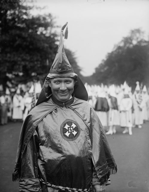 The Klan at the time didn’t have a strict dress code that we associate with Klansmen nowadays; the group members tried to make their own uniforms and costumes colourful and appealing – robes, conical hats and masks made them terrifying and anonymous at the same time.