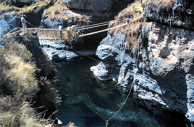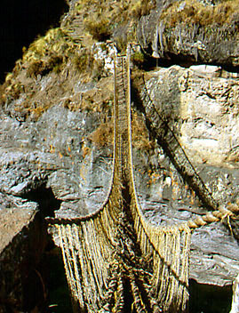 Bridges can differ in their use, construction type, and building material. Some of the oldest and most interesting bridges ever built are rope bridges. Originally built by the Inca civilization in the Andes Mountains in Peru, South America. These constructions were simple suspension bridges, build over rivers, gorges, and canyons. The Inca did not use wheeled transport and moved around on foot. The rope bridges were a part of the Inca road system, and they show how advanced and innovative this nation was.