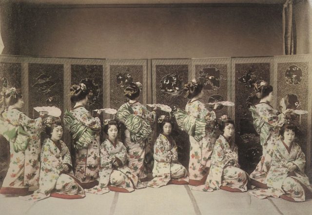 The forerunners of the female geisha were the teenage odoriko (“dancing girls”): expensively trained as chaste dancers-for-hire. In the 1680s, they were popular paid entertainers in the private homes of upper-class samurai, though many had turned to prostitution by the early 18th century. Those who were no longer teenagers (and could no longer style themselves odoriko) adopted other names—one being “geisha“, after the male entertainers. The first woman known to have called herself geisha was a Fukagawa prostitute, in about 1750. She was a skilled singer and shamisen-player named Kikuya who was an immediate success, making female geisha extremely popular in 1750s Fukagawa. As they became more widespread throughout the 1760’s and 1770’s, many began working only as entertainers (rather than prostitutes) often in the same establishments as male geisha.