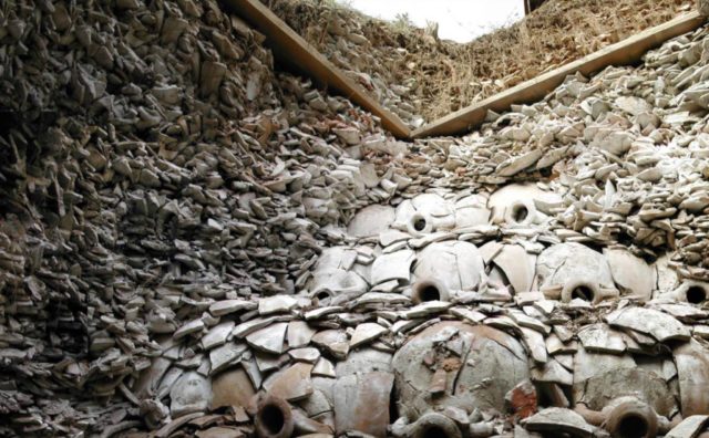 Another possibility is that the residual oil left on the shards would have reacted poorly with the lime content used when making the concrete. José Remesal of the University of Barcelona and co-director of the Monte Testaccio excavations believes the hill contains the remains of over twenty-five million amphora, and his team is recovering over a ton of pottery every day.